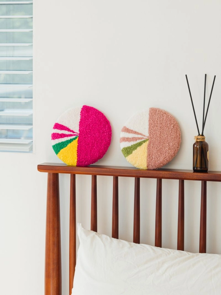 한국의 전통 사탕인 옥춘은 아름다운 구슬과 화사한 봄이란 의미를 가진 사탕으로 빨간색, 흰색, 노란색, 초록색이 사용된것이 특징입니다. 옥춘은 큰 잔치나 좋은날을 밝혀주는 장식으로 사용하는데, 내가 사랑하는 사람이 나에게 오늘 길을 환하게 밝혀 등불이 돼 준다는 의미가 있다고 전해집니다. 사랑하는 이들의 매일이 화사한 봄이길 바라는 마음으로 디자인한 미니 러그입니다. 40cm의 경우 의자용 방석으로, 50cm는 좌식용 방석 또는 포인트 러그로 사용하기 좋은 사이즈 입니다. 옥춘에서 모티브를 얻어 디자인한 옥춘 러그는 일상생활 속에서도 활용도 높게 사용 가능하도록 터프팅 전용 원사 및 손바느질로 제작되어 세탁기 사용과 건조기 사용이 가능한 상품입니다. 원화의 느낌을 작가만의 감성으로 재구성해 멀게 만 느껴졌던 한국의 전통을 일상에서 편하게 경험할 수 있도록 했습니다.