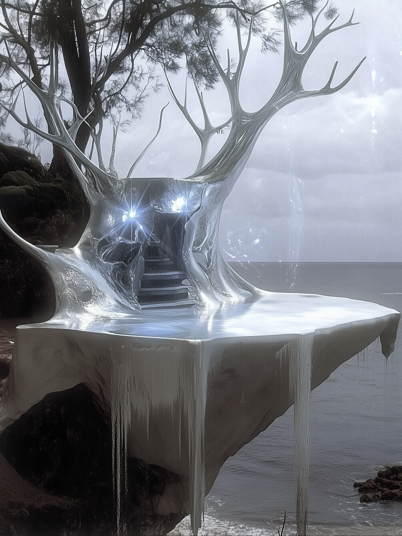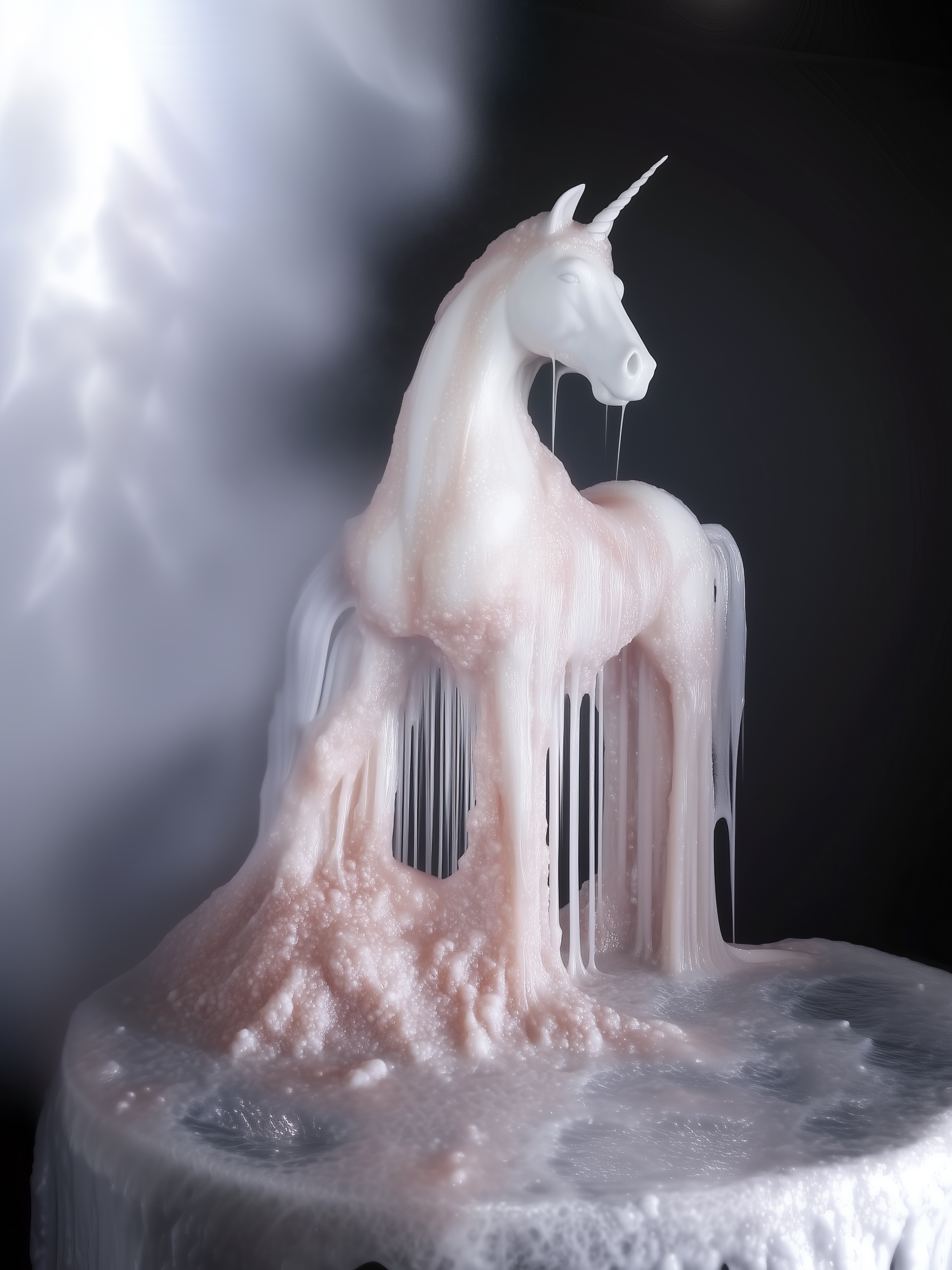 이 작품은 순수함과 신성함의 상징인 유니콘이 서서히 녹아내리는 모습을 통해, 형태의 해체와 상징의 전복을 이야기합니다. 젤라틴처럼 흐르는 유니콘의 형상은 고체에서 액체로, 정형에서 비정형으로 변화하는 ‘화(化)’의 과정을 시각화합니다. 분홍빛과 흰빛이 어우러진 유기적인 질감은 퇴화와 재탄생, 그 경계에 놓인 감각을 불러옵니다. 강한 명암과 빛의 흐름은 신화적 존재가 무너지는 찰나를 몽환적으로 포착하며, “존재의 본질은 형상이 아닌 변화 그 자체”라는 질문을 던집니다.