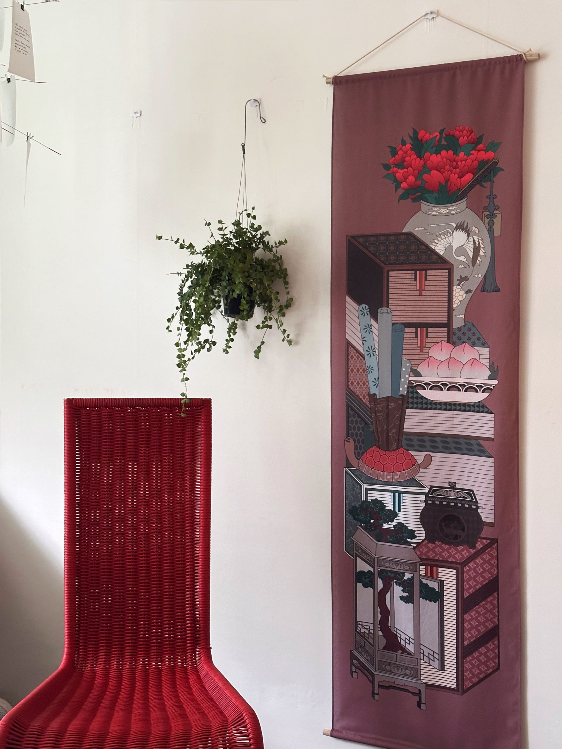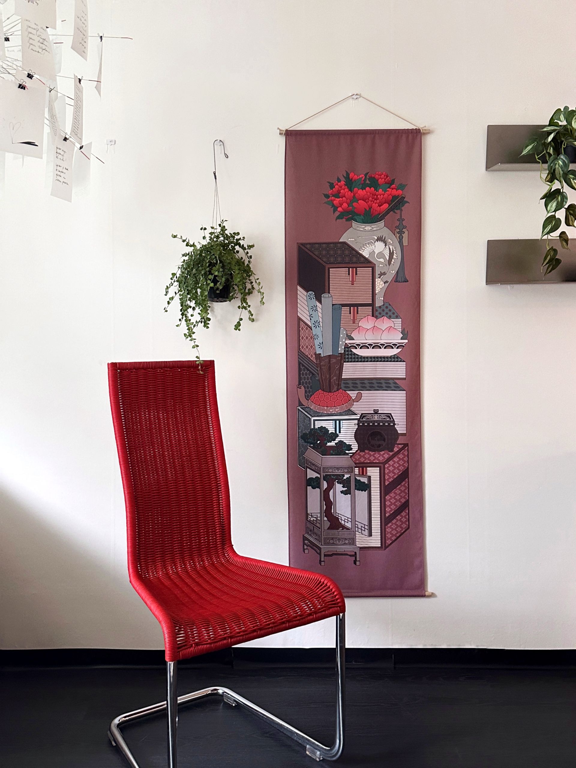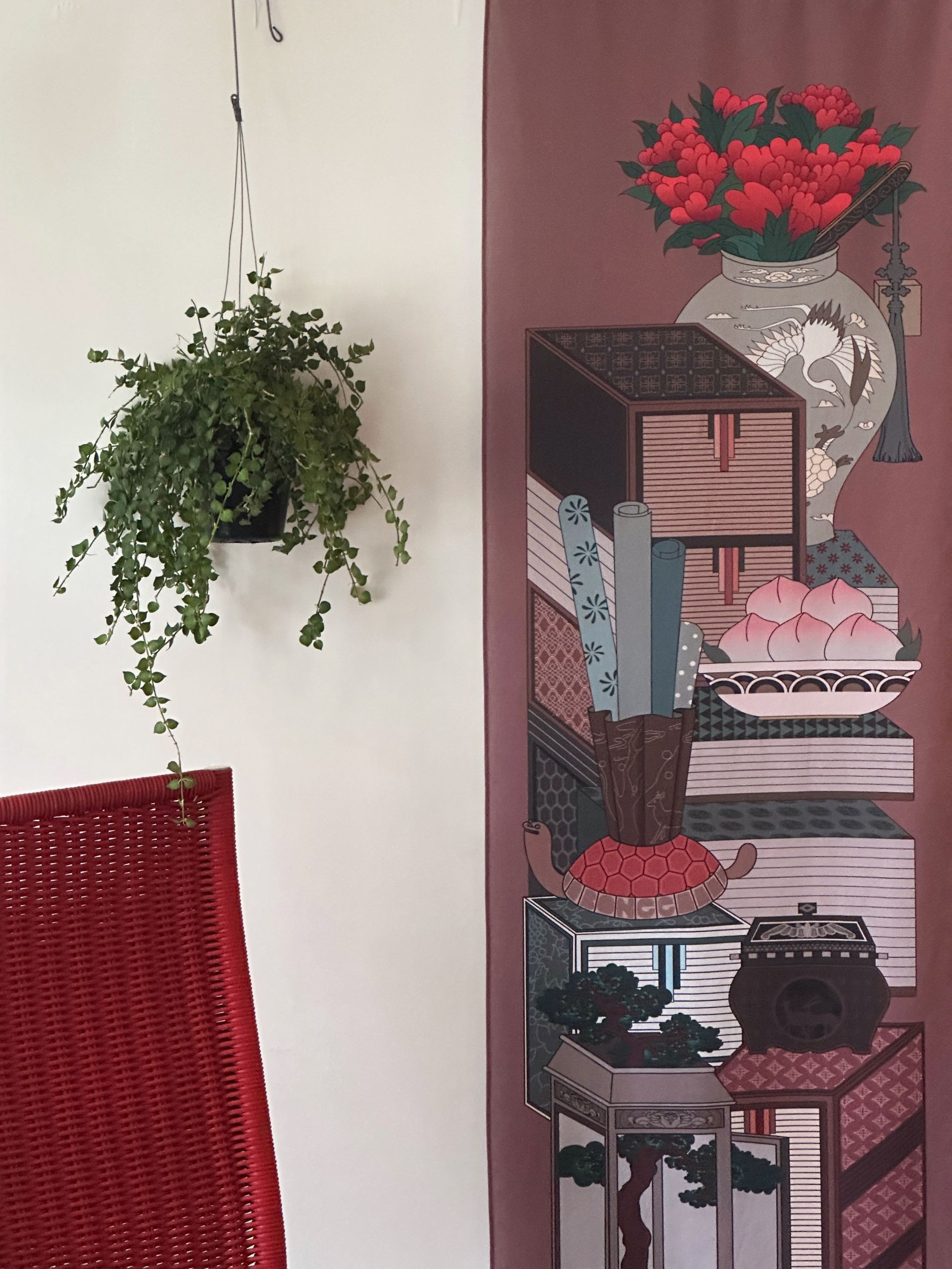 책과 다양한 상징 기물을 함께 그린 '책거리'는 조선시대에 유행한 한국적인 정물화입니다. 거북, 사슴, 학, 복숭아, 소나무 등 장수와 건강을 상징하는 요소들이 어우러져, 오래도록 문화와 예술을 즐기는 풍요로운 삶을 기원합니다. 테이블 러너로 활용하거나 목봉을 이용해 족자 형태로 벽에 걸어두면, 전통의 멋과 현대적 감각이 조화된 공간을 완성할 수 있습니다.