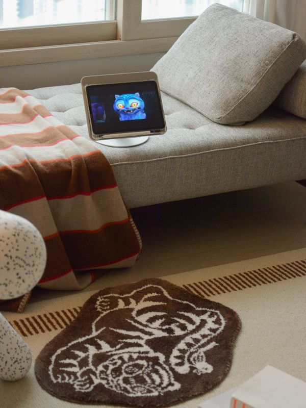 한국 민화에서 영감을 받아, 현대적인 그래픽 언어로 재해석하는 브랜드 '보니'의 호작도 러그 🐅🐦⬛ 부드러운 촉감과 차분한 브라운 컬러 포인트로 두기 좋아서 거실 한 켠에 연출했어요!