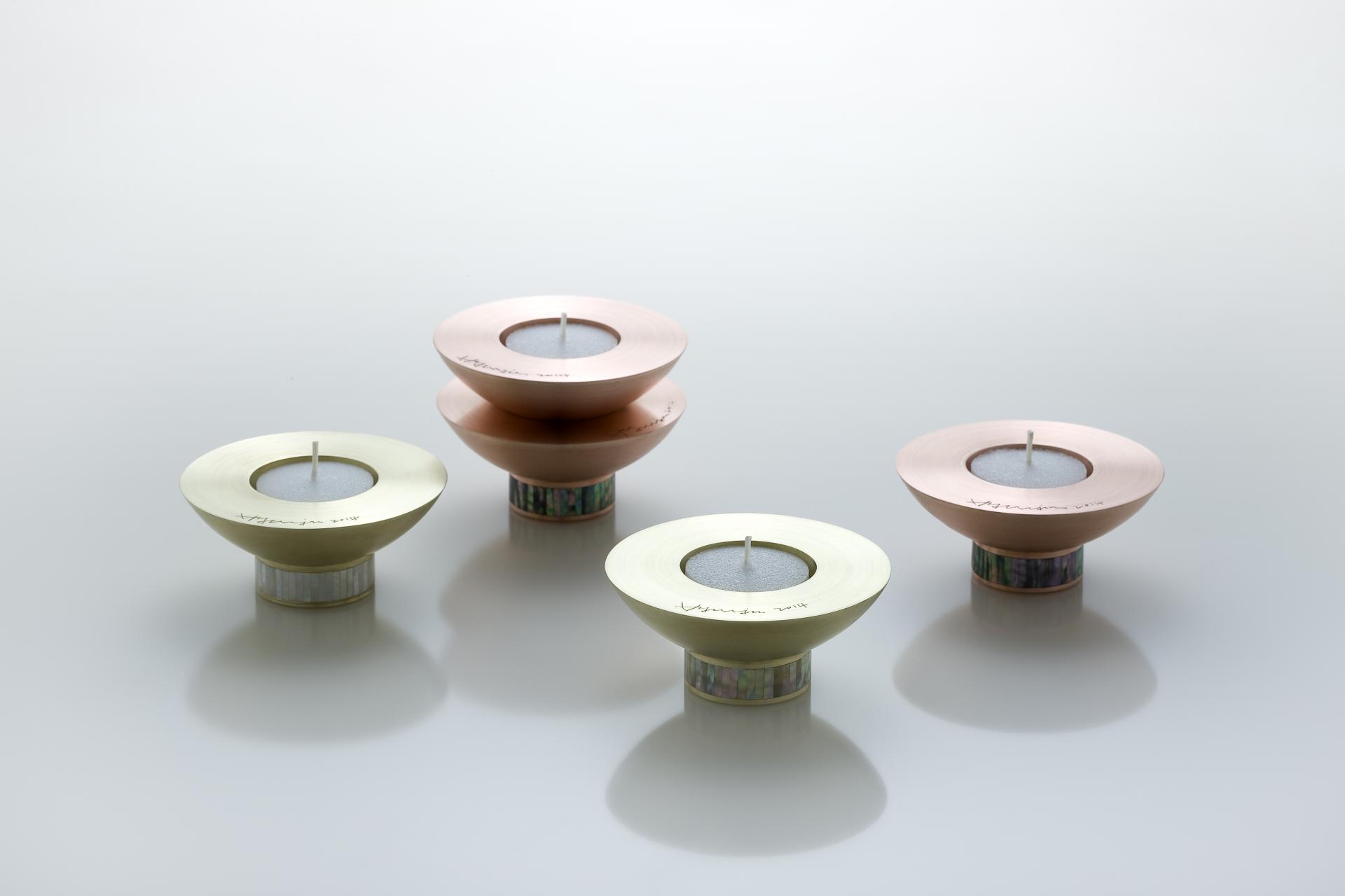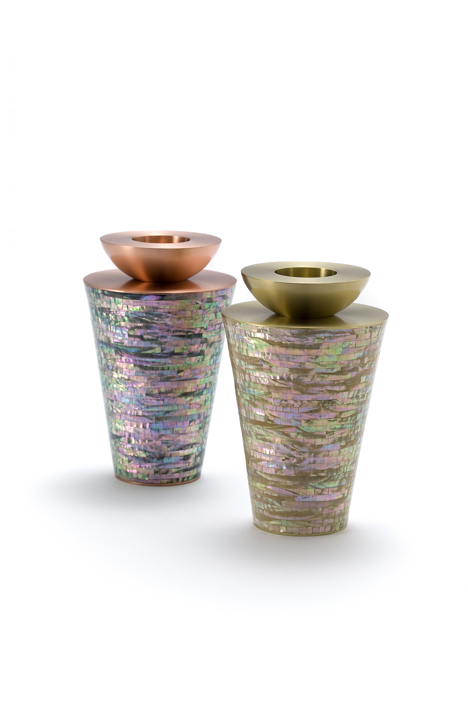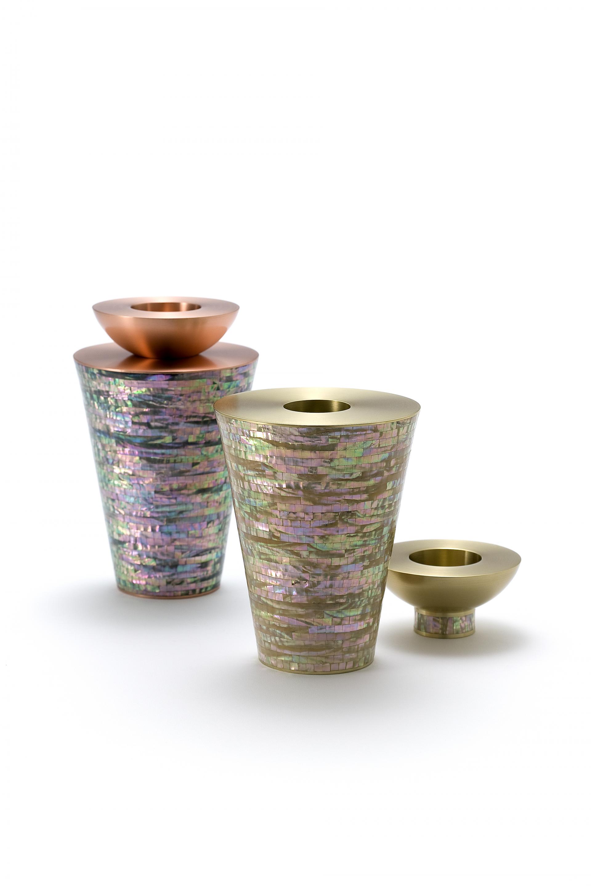 금속과 나전을 조화롭게 결합한 이 작품은 전통기법인 끊음질과 금속 조형을 바탕으로 현대적인 감각을 더한 공예품입니다. 고려시대부터 천년을 이어져온 나전의 오색영롱한 자개는 유기적으로 흐르는 곡면 위에 한땀 한땀 정성스럽게 붙여져, 마치 햇빛에 반짝이는 바다처럼 또 다른 풍경을 만들어 냅니다. 금속을 망치로 성형하고 고온 경화 기법인 금태칠을 입힌 뒤, 보석을 세팅하듯 자개를 정교하게 배치하는 이 작업은 장인의 정성과 집중력을 바탕으로 전통과 현대, 물성과 감성이 만나는 지점을 섬세하게 구현하며 금속 위에 자연의 생명력을 담아 시간과 공간을 아우르는 조형 언어를 구축합니다.