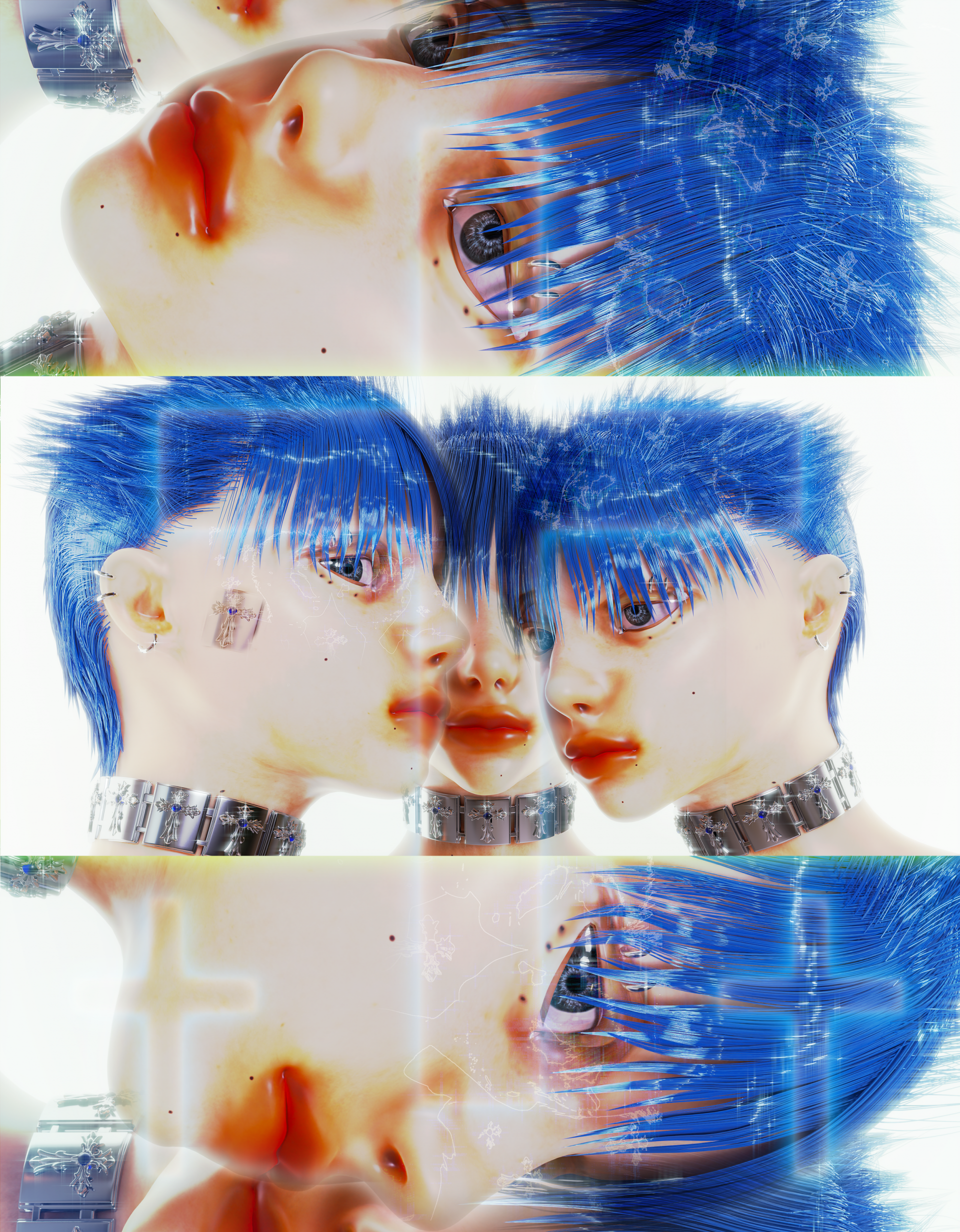 현실보다 선명한 얼굴, 반복되는 시선, 인위적으로 조율된 감정의 흔들림. 이 작품은 디지털 인물의 단편적인 정체성을 조각처럼 겹쳐내며, 인간성과 비인간성의 경계에 질문을 던집니다. 왜곡된 구도와 중첩된 시선은 관찰의 불안과 자아의 분열을 은유하며, 마치 감정 알고리즘이 만들어낸 새로운 초상처럼, 낯설고도 아름다운 감각을 자아냅니다.