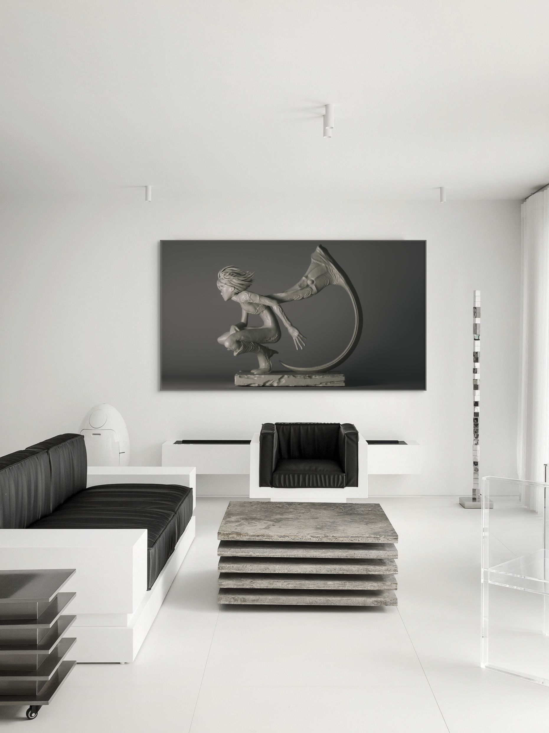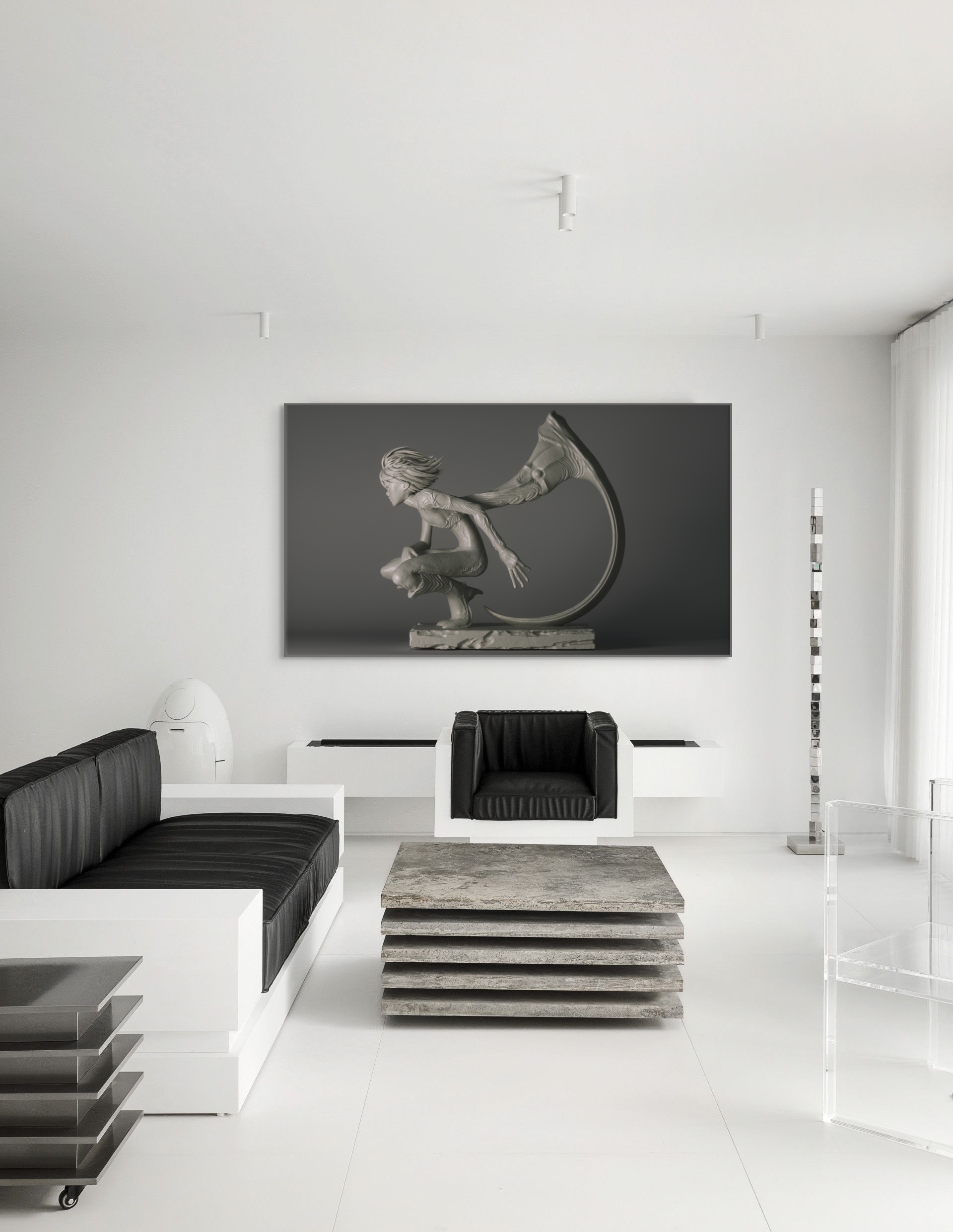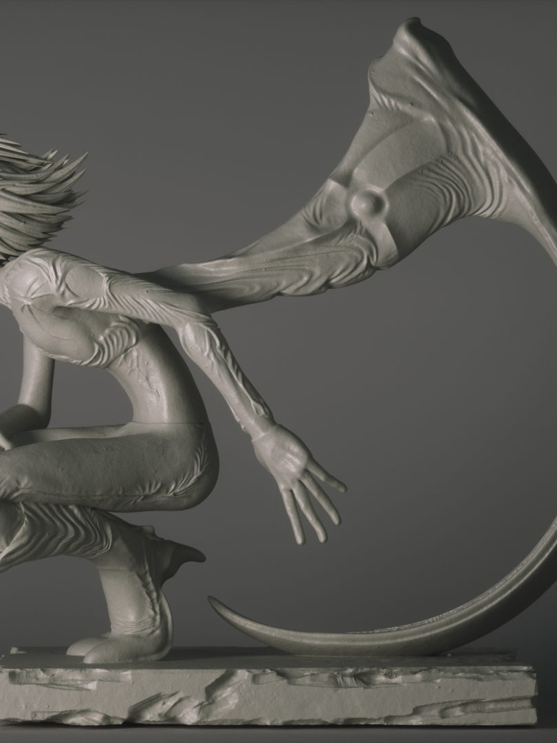 디지털 조형의 정밀성과 서사적 상상력이 결합된 이 작품은, 유기적으로 뻗어나가는 신체와 상징적 곡선, 흐르는 듯한 질감을 통해 캐릭터의 내면 에너지와 정서를 시각화합니다. 가상의 세계에서 추출된 감정과 존재는 3D 그래픽 기반의 조형 언어로 재구성되어 하나의 장면, 하나의 이야기 안으로 끌어들입니다. 역동성과 정적인 긴장감이 공존해 이미지 이상의 몰입을 선사하며 공간에 상상력과 에너지를 불어넣는 오브제가 됩니다.