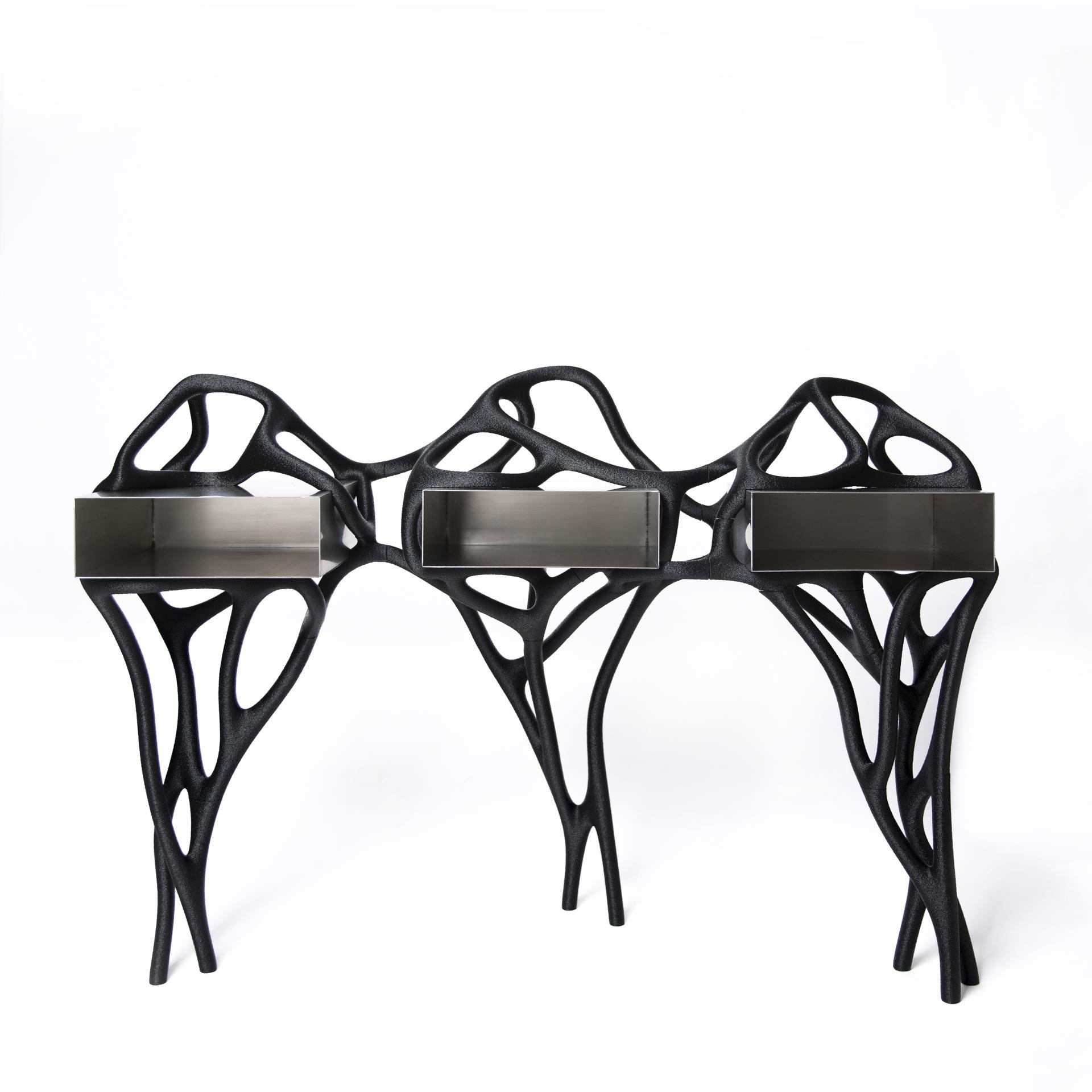 강인규 작가의 작품은 컴퓨터 알고리즘으로 생성된 유기적 형상을 3D 프린팅을 통해 구현하며, 덩굴이나 세포, 산호를 떠올리게 하는 독특한 조형미를 지닙니다. 인간과 기계의 협업으로 완성된 작업들은 미래적인 감각을 담은 오브제이자 가구로, 예술과 기술의 경계를 자연스럽게 넘나듭니다. 기계적 프로세스 속에 자연의 질서를 담아낸 작품은 공간에 생명력 있는 에너지를 불어넣습니다.