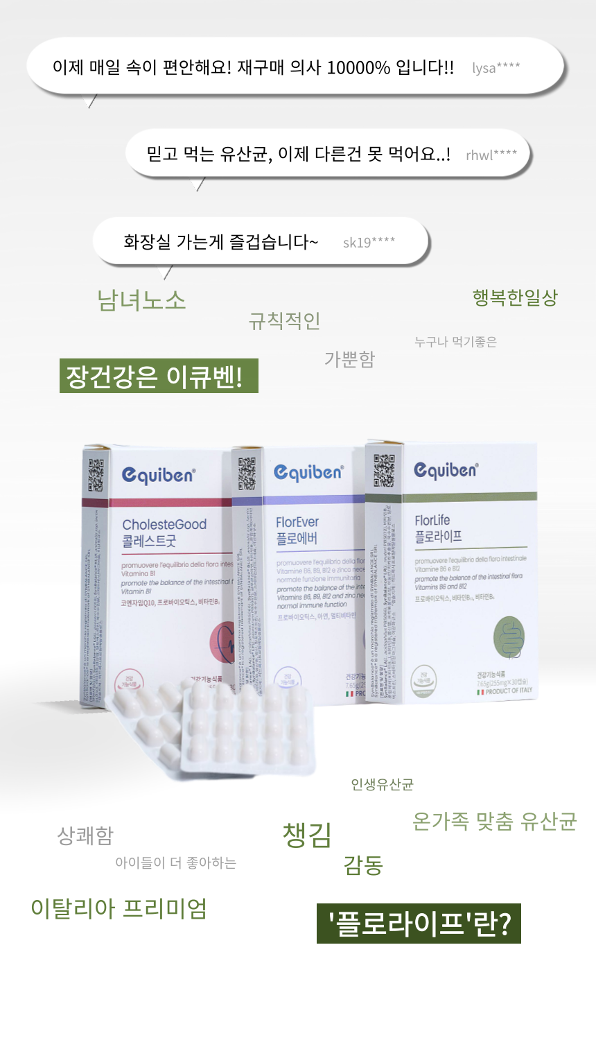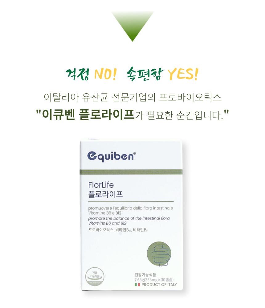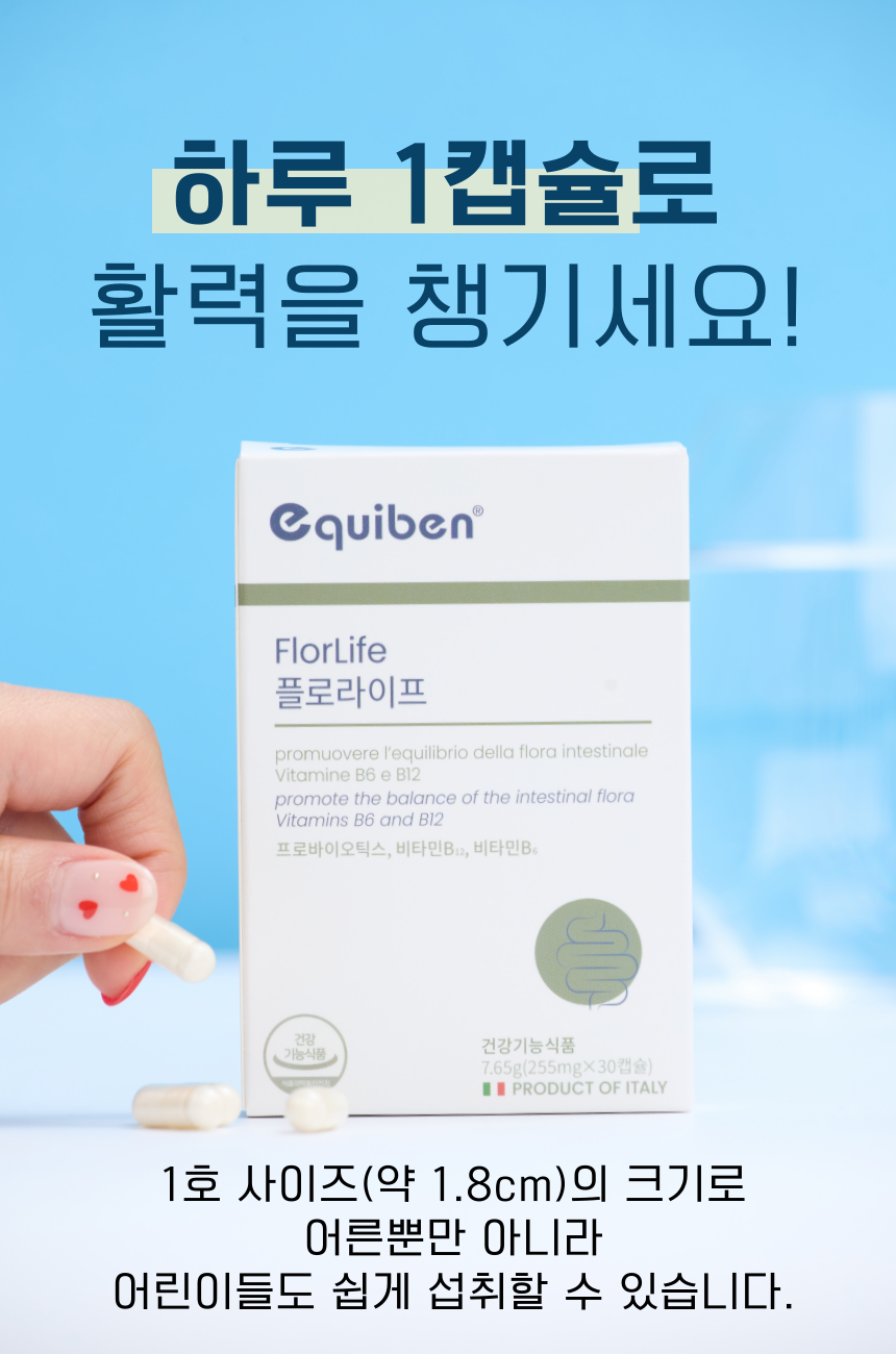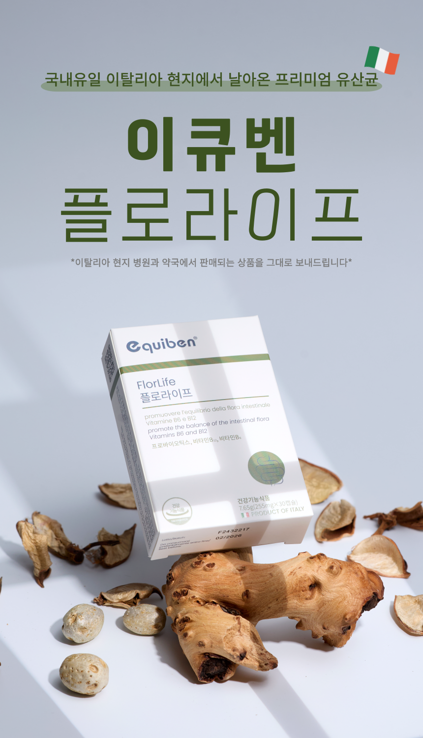 플로라이프(FlorLife)는 이탈리아 현지 병원과 약국에서 판매되는 온 가족용 프리미엄 유산균으로, 10일 내 장 건강 개선 효과를 목표로 설계된 고기능성 제품입니다. 유산균과 비타민을 최적의 밸런스로 배합해 장내 환경을 부드럽게 조절하며, 어린이부터 성인까지 누구나 안심하고 섭취할 수 있도록 만든 이큐벤의 대표 맞춤형 유산균 솔루션입니다.