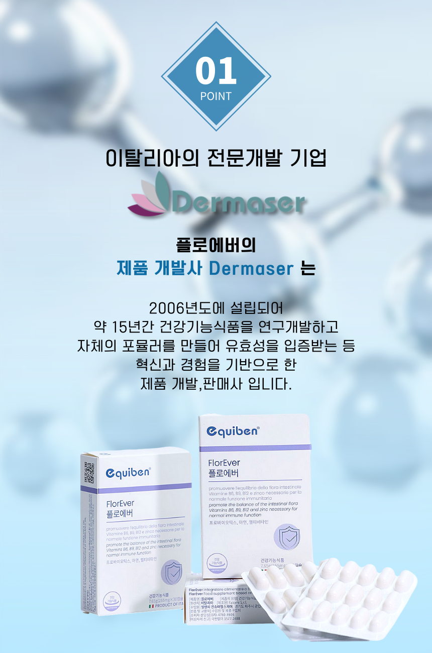 플로에버(FlorEver)는 면역 체계를 강화해 계절성 감염 발병률을 낮춘 임상시험 완료된 유산균으로, 균주 기반 프로바이오틱 효과가 면역 세포 기능과 염증 반응 개선에 기여한다는 연구 결과를 바탕으로 설계된 제품입니다. 자연스럽게 면역 장벽을 튼튼하게 해주는 안심형 솔루션입니다.