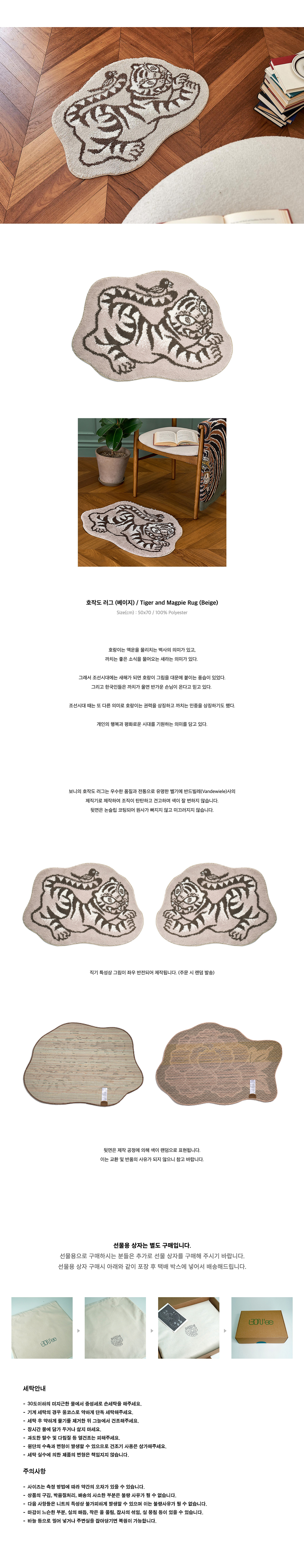 호랑이는 액운을 물리치는 벽사의 의미가 있고, 까치는 좋은 소식을 물어오는 새라는 의미가 있습니다. 조선 시대에는 새해마다 호랑이 그림을 대문에 붙이며 액운을 막고 복을 기원했으며, 까치 울음은 반가운 손님의 도래로 여겨졌습니다. 이 러그는 권력과 민중의 조화를 상징하며, 마치 대화를 나누는 듯한 호랑이와 까치의 모습 속에 개인의 행복과 평화로운 시대를 바라는 마음을 담아 디자인했습니다.
