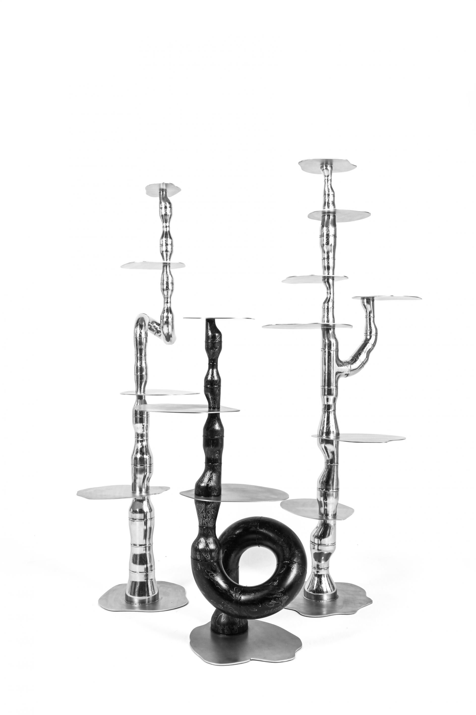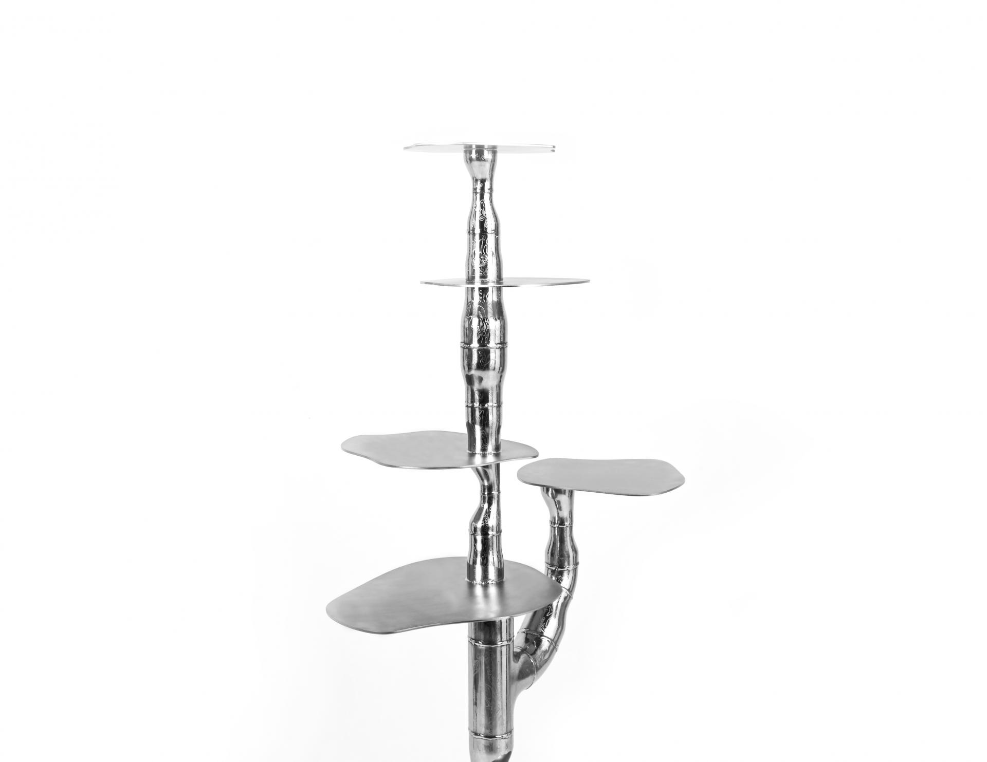 이 작품은 산업과 자연, 인공물과 유기체적 요소의 경계를 탐구하는 아트 퍼니처 시리즈로, 대량 생산되는 산업 부품의 가치와 지속 가능성에 대한 질문에서 출발합니다. 작가는 공장에서 기계적으로 생산되는 파이프 피팅을 통해 자연의 흐름과 유기적 구조를 표현하며, 차갑고 규격화된 산업 부품에 손으로 세공한 나무의 질감을 결합하여 새로운 생명력을 불어넣습니다. 단순한 가구를 넘어 공간 속 조형 설치물로서 기능하며, 유연성과 흐름을 상징하는 형태는 시간, 변화, 존재의 의미를 탐구하는 시각적 서사를 담고 있습니다.