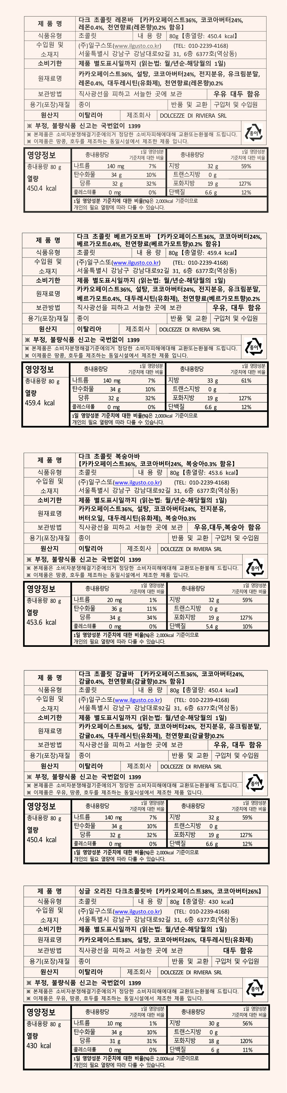 • 성분 : 에콰도르산 프리미엄 카카오에 이탈리아 각 지방의 특산물을 정교하게 블렌딩한 장인 초콜릿