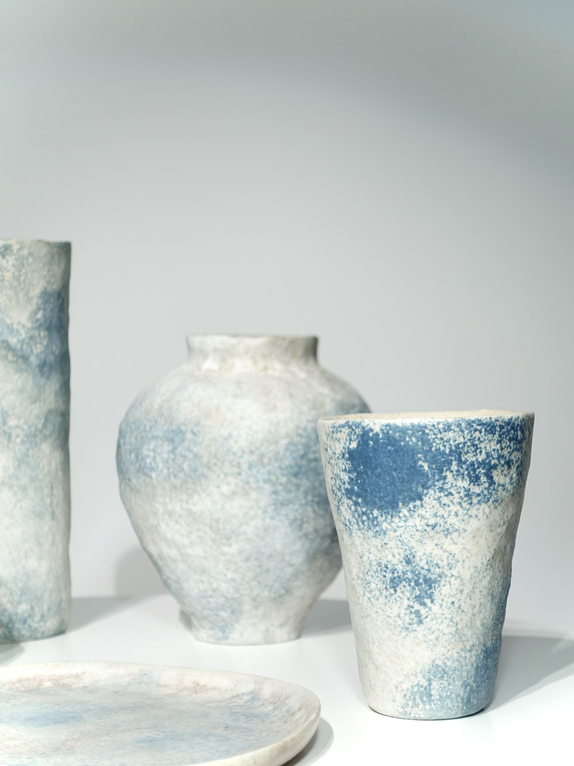 김유상 작가는 도예가이자 문화재 수리 전문가로, 전통과 현대를 잇는 감성적인 도자 작업으로 주목받고 있습니다. 중앙대학교 공예과를 졸업한 후 일본 도쿄예술대학에서 문화재 보존수복 도자 전공으로 석사 학위를 취득하며 분청사기 복원에 깊이 몰두했습니다. 작품은 하늘빛과 자연의 질감을 회화적으로 담아내며, 환원소성과 독자적으로 개발한 유약과 흙을 통해 비정형의 조형성과 감성적 깊이를 표현합니다.