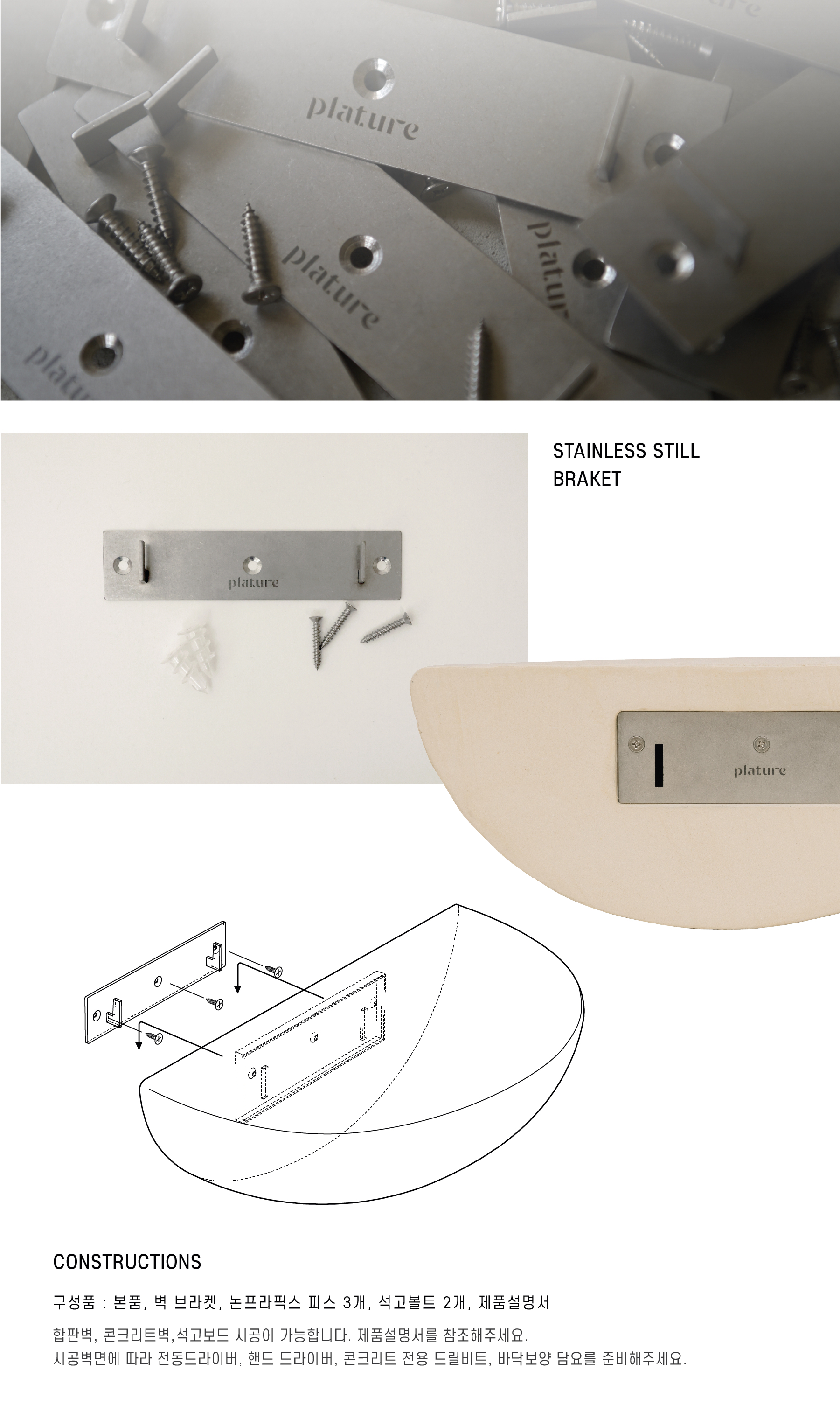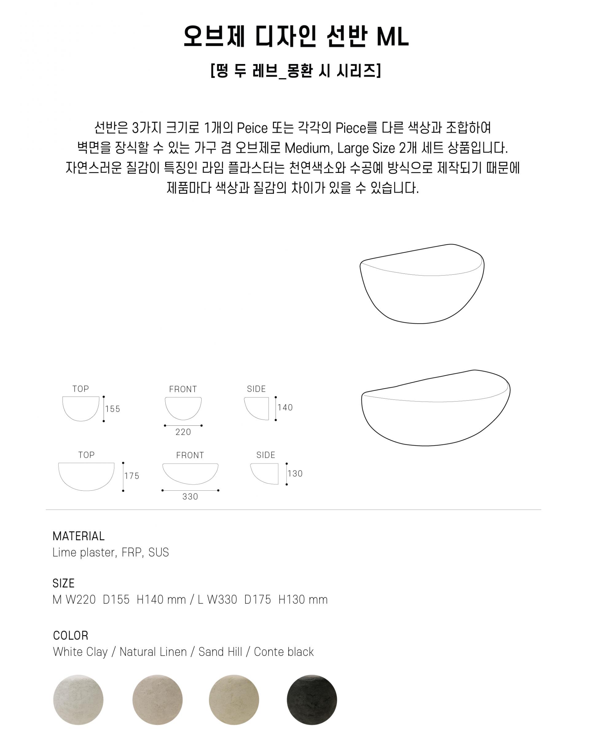 프리미엄 천연 소재로 제작된 네추럴한 텍스처와 묵직한 깊이감이 감도는 핸드크래프트 퍼니처 입니다. 라임플라스터에 레진과 몰탈혼합물이 포함된고강도 소재로 선반의 경우 거친 입자를 포함하여 천연석재의 질감을 느낄 수 있습니다. 4가지 칼라와 크기를 조합하여 공간에 따라 벽선반, 오브제로 사용하기 좋고, 탈부착이 쉽도록 설계된 스테인리스 소재의 브라켓과 라임 소재 특성상 빛의 각도에 따라 오묘한 색감을 표현하는 유니크한 아이템입니다.