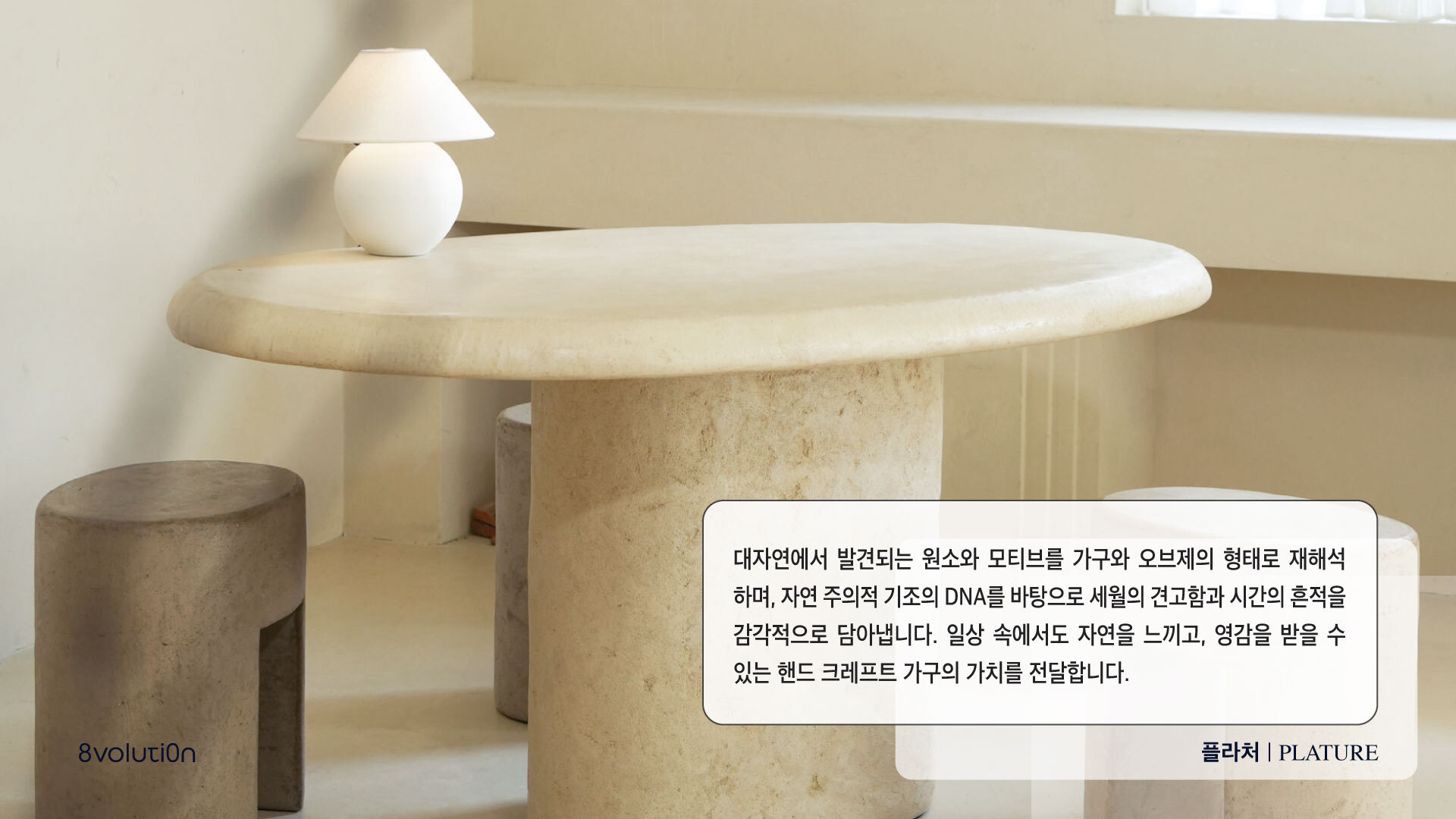 플라처는 과거에서 현재, 그리고 미래까지 시대를 관통하는 지속 가능한 자연 그대로의 아름다움을 이야기하는 핸드크래프트 퍼니처 브랜드입니다. 유럽에서 오랜 역사를 가진 천연 소재 ‘라임 플라스터’를 사용해 가구 표면에 핸드 텍스처링과 에이징 기법을 더해 각각의 오브제마다 오직 하나뿐인 고유한 질감을 완성합니다. 강렬한 햇빛에도 변색되지 않는 천연 색소로 구현된 깊이 있는 컬러는 빛의 각도에 따라 오묘한 반사감을 주며, 어떤 공간에서도 자연스럽게 어우러집니다. 시간이 지날수록 더욱 단단해지고 세월의 흔적을 담아내는 플라처의 가구는 바쁜 일상 속에서도 자연을 가까이 느끼며 오래도록 영감을 주는 존재로 함께합니다.