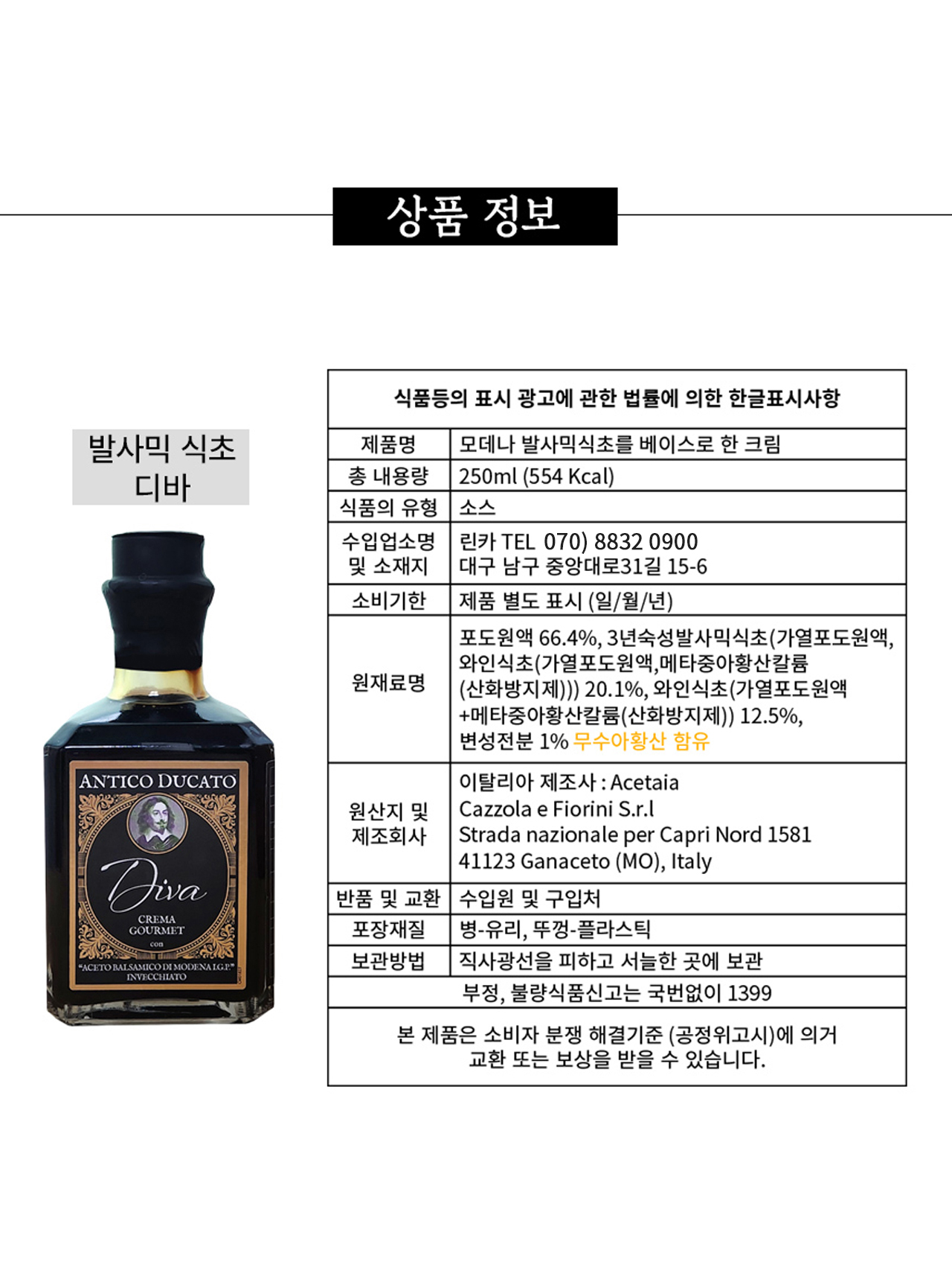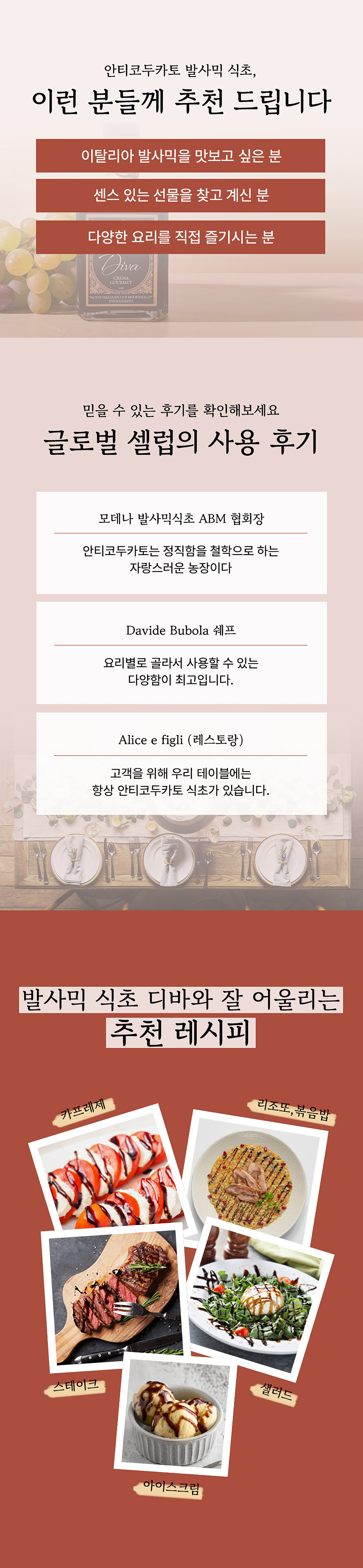 • 성분 : 포도원액과 3년 숙성 발사믹 식초를 고급스럽게 블렌딩한, 깊고 균형 잡힌 풍미의 프리미엄 발사믹