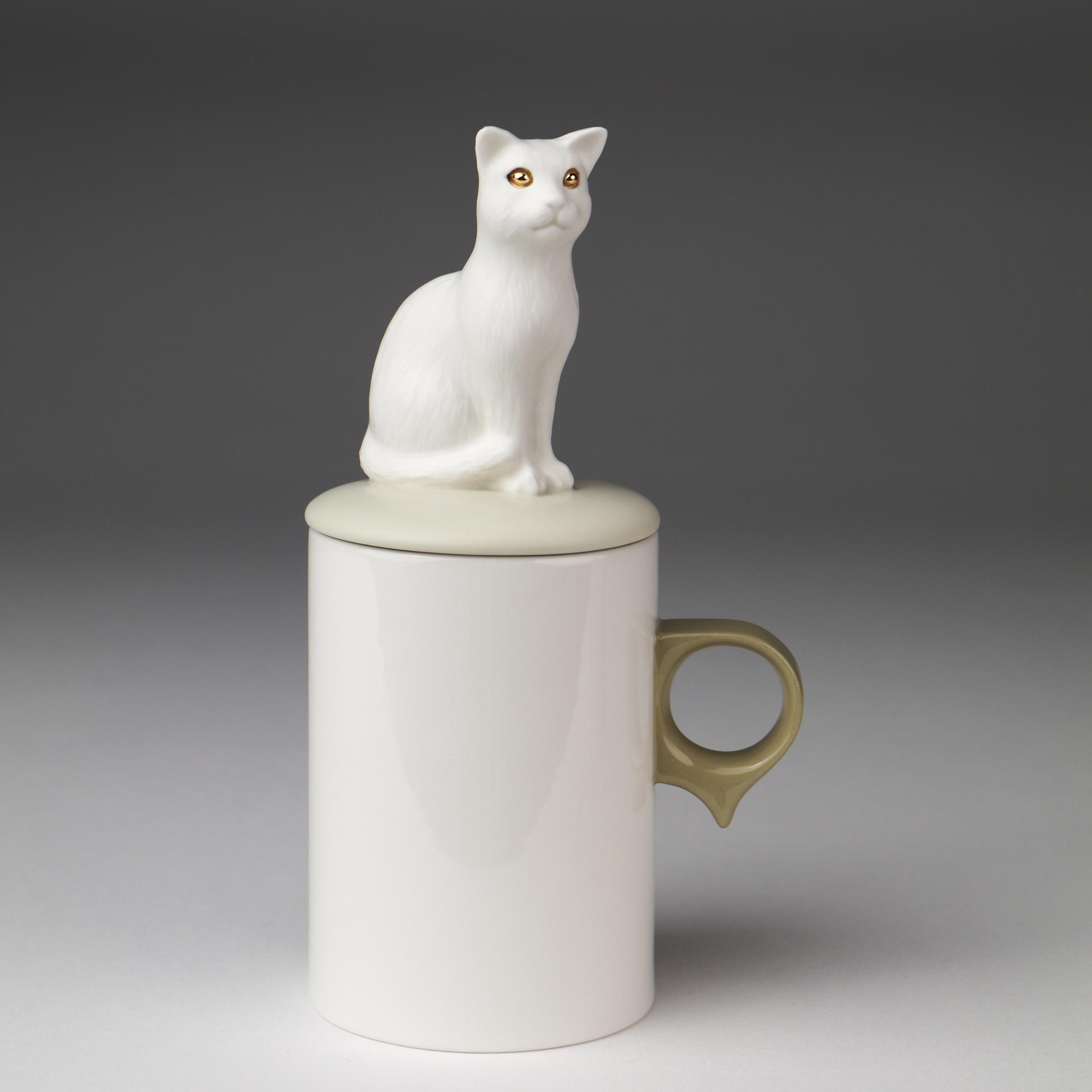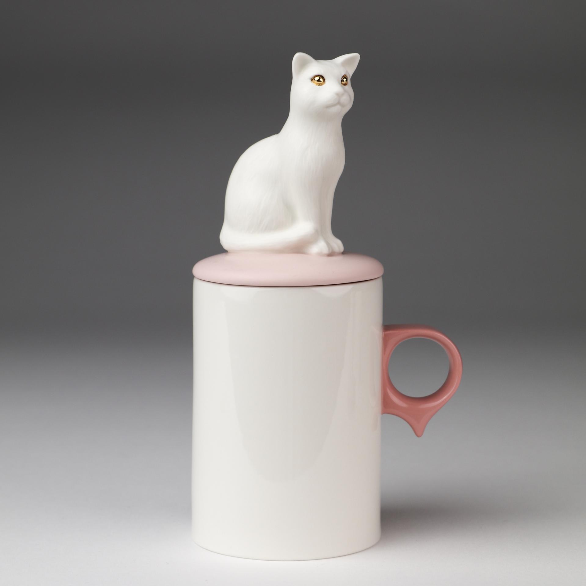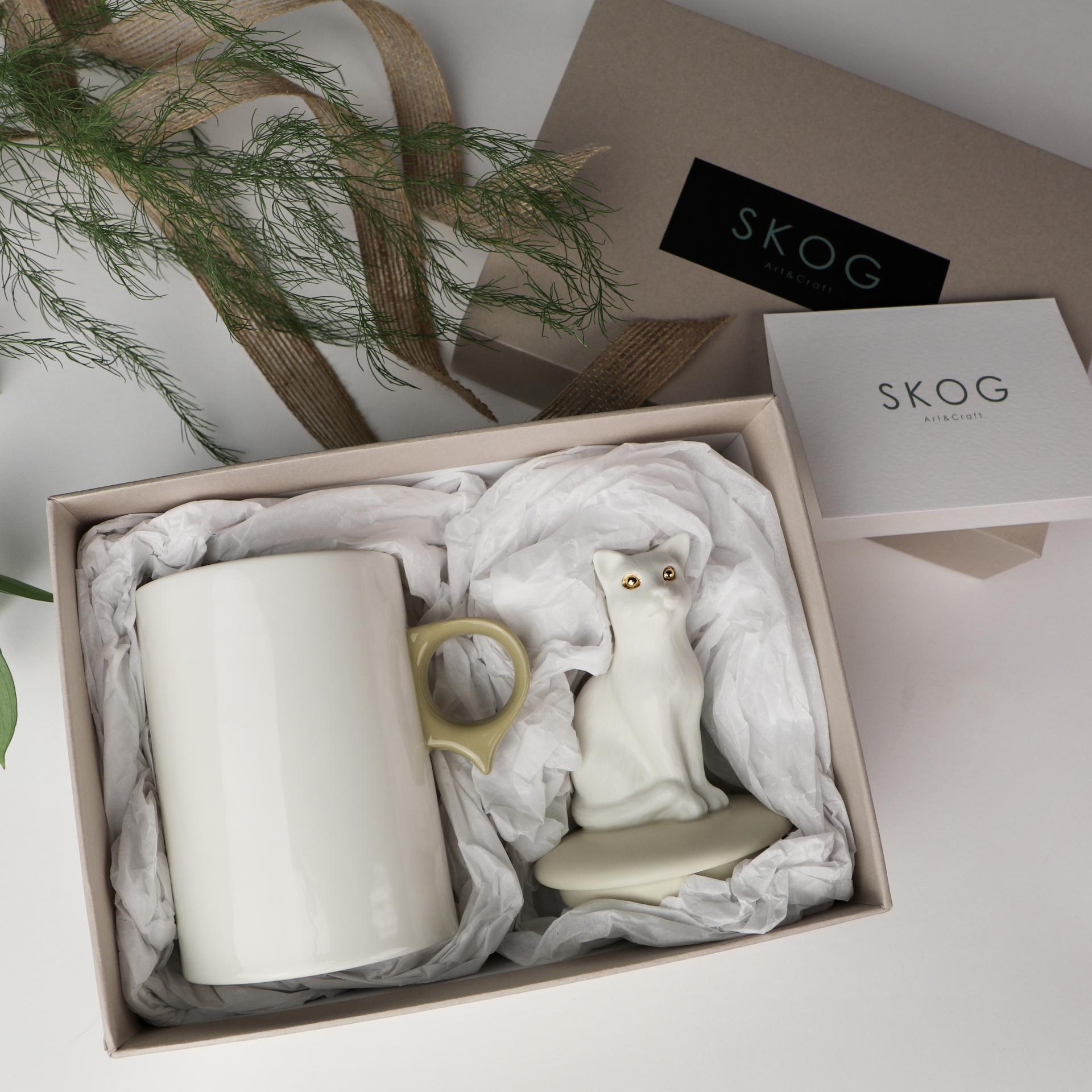 SKOG의 '고양이 오브제컵'은 세밀하게 조각된 고양이 오브제 뚜껑과 일상에서 자주 사용되는 컵의 조화로 만든 '일상 속 오브제 컵'입니다. 친근한 고양이 오브제가 컵 뚜껑의 손잡이 역할을 할 수 있도록 하였습니다. 고양이 오브제 뚜껑은 부드러운 촉감의 무광유약을, 컵 부분은 실용성을 고려한 투명 광택유약을 사용하였습니다. 여러번의 수정과정을 거쳐 특별하게 디자인된 컵 손잡이의 아랫부분 돌출부는 손가락 지지대 역할을 하여 안정적으로 컵을 잡을 수 있게 해줍니다.