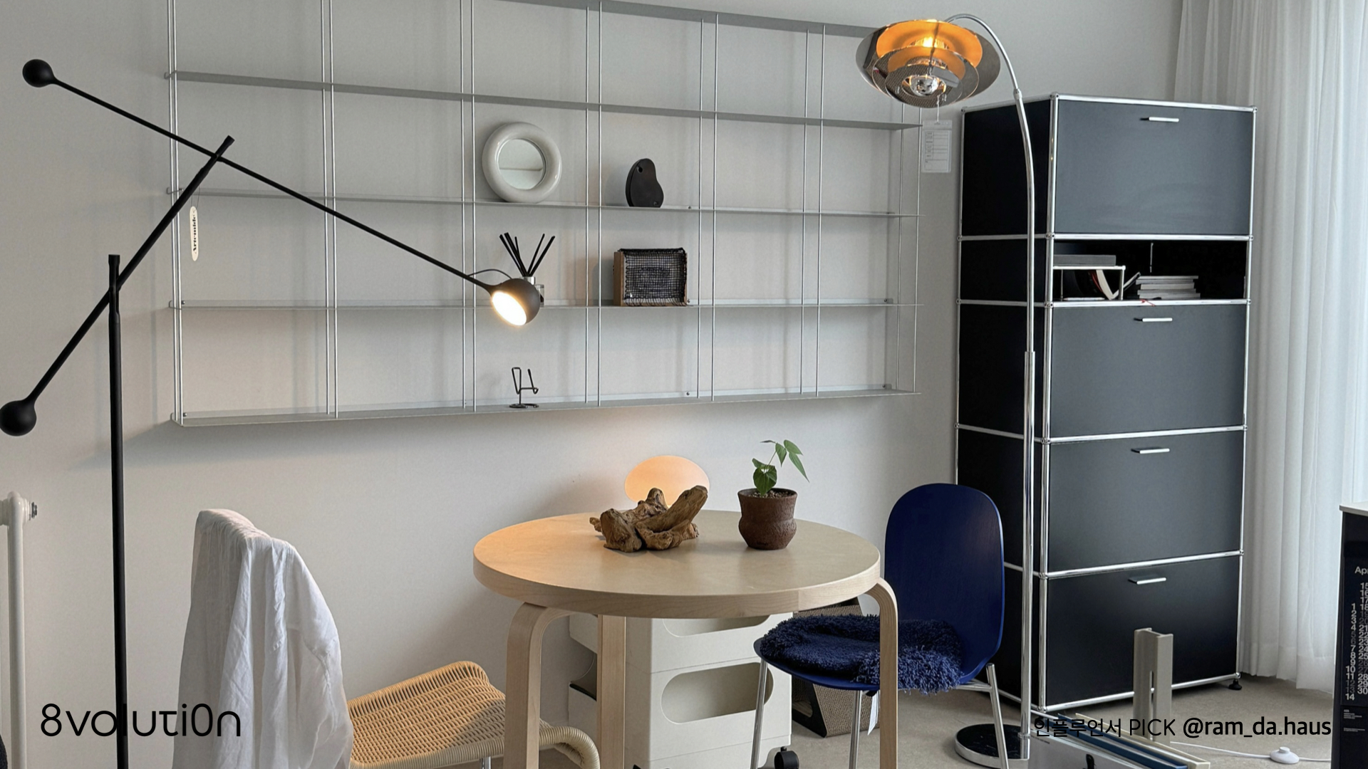 버치테이블, 텍타체어, 블랙가구, 금속선반과 멋진 조명이 어우러진 공간