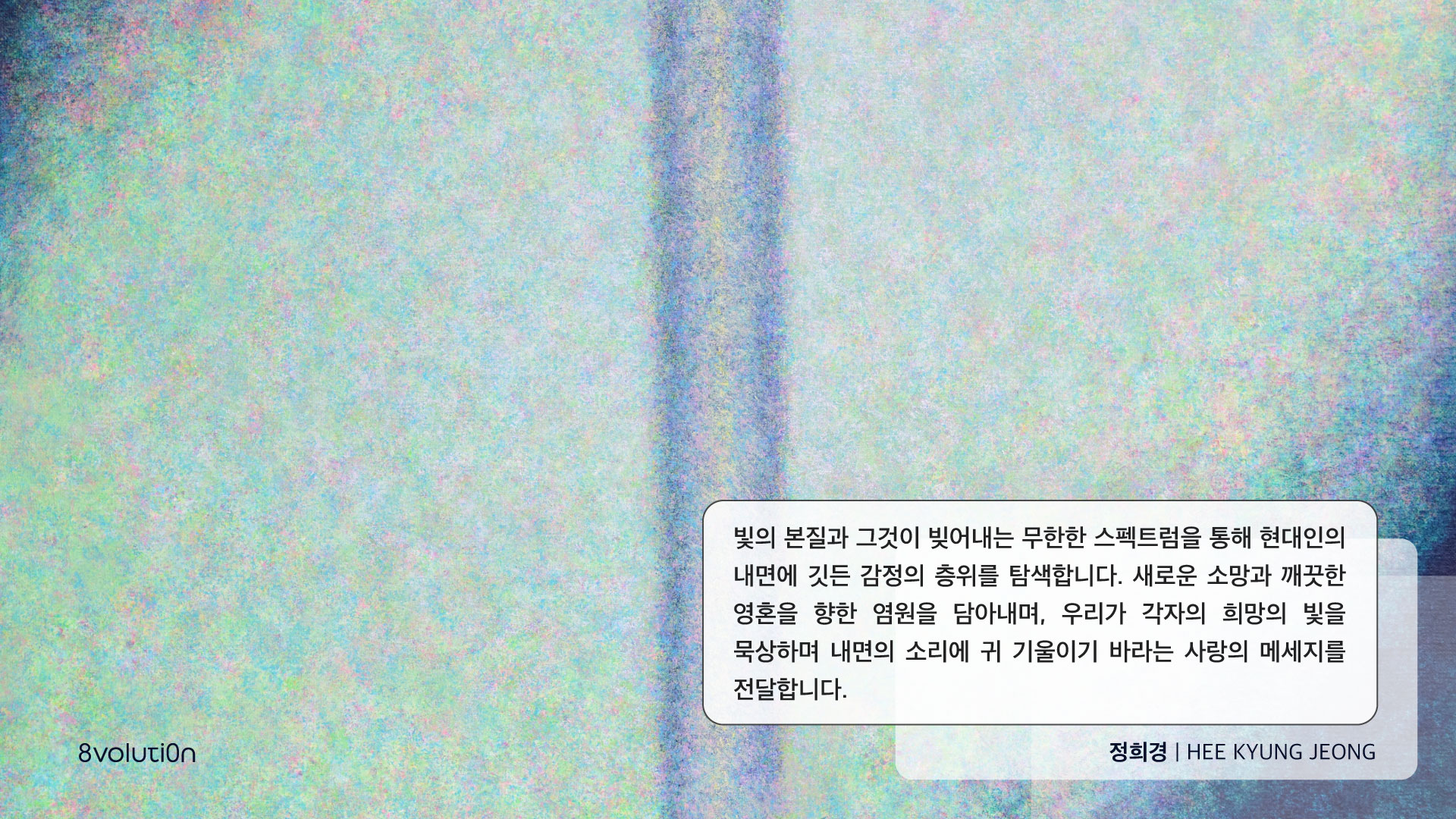 빛이 빚어내는 다양한 스토리를 통해 우리 영혼에 생명을 주는 내면의 빛에 중점하여 표현한 정희경 작가의 추상회화 시리즈 입니다. 수많은 빛을 품은 무지개처럼 작품의 내면에는 희망과 사랑, 아름다움을 품어 내길 바라는 작가의 메세지가 담겨있습니다. 풍부한 푸른 빛깔이 녹아져 시선을 사로잡는 작품으로 시간의 흐름, 자연의 층을 표현하며 끊임없이 변화하는 미묘한 세계 속에서 새로운 순간을 느낄 수 있는 작품입니다. 신비롭게 퍼져 나오는 빛이 주는 파동으로 환상적인 빛의 속삭임을 만나보세요.