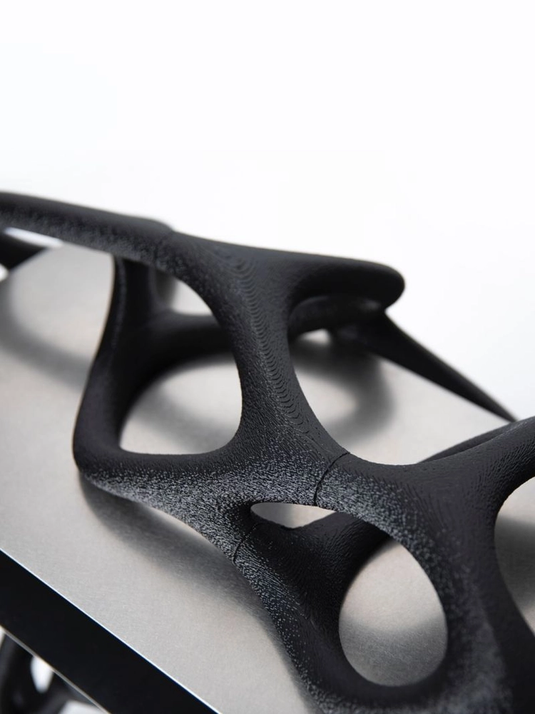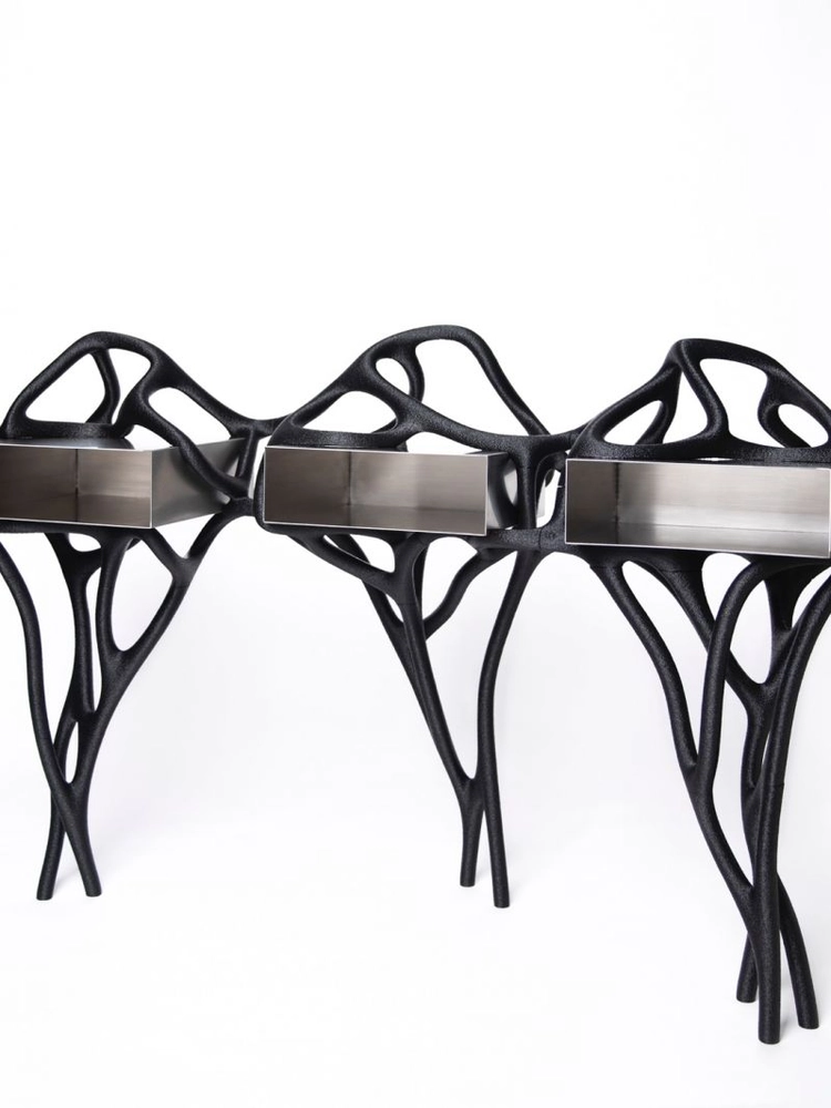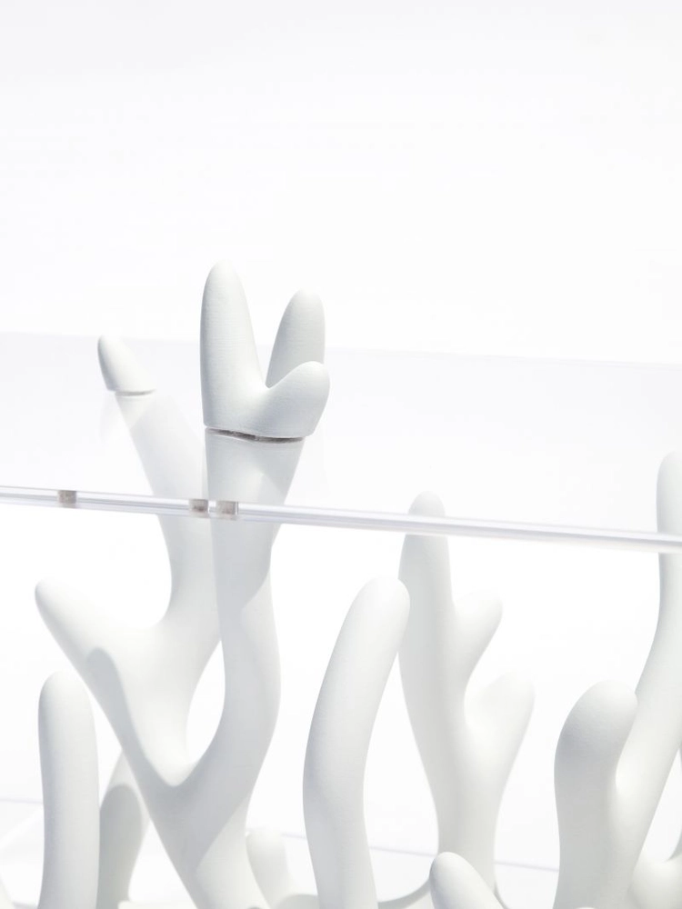 강인규 작가의 작품은 컴퓨터 알고리즘으로 생성된 유기적 형상을 3D 프린팅을 통해 구현하며, 덩굴이나 세포, 산호를 떠올리게 하는 독특한 조형미를 지닙니다. 인간과 기계의 협업으로 완성된 작업들은 미래적인 감각을 담은 오브제이자 가구로, 예술과 기술의 경계를 자연스럽게 넘나듭니다. 기계적 프로세스 속에 자연의 질서를 담아낸 작품은 공간에 생명력 있는 에너지를 불어넣습니다.